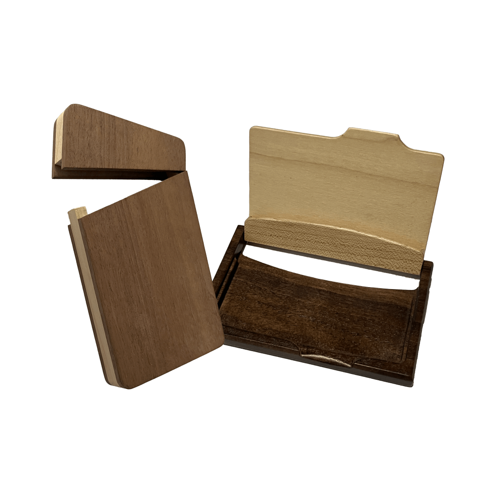 Személyre szabott gravírozás logóval és névvel – a fa névjegykártyán és a tartódobozon is, teljesen igényeid szerint.